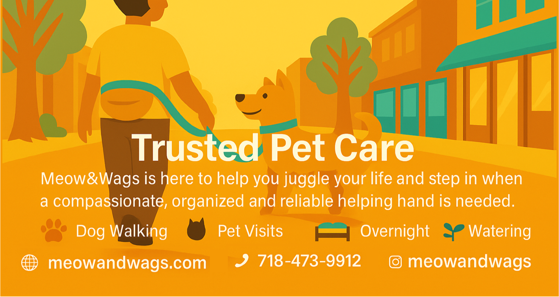Before launching Meow & Wags, I worked as a dog walker and pet sitter in Brooklyn, NY, and spent over a decade as an executive assistant. This experience sharpened my time management, customer service, and organizational skills — all of which now contribute to creating smooth, stress-free experiences for both pets and their owners. I also know what it feels like to be a busy professional trying to juggle it all.